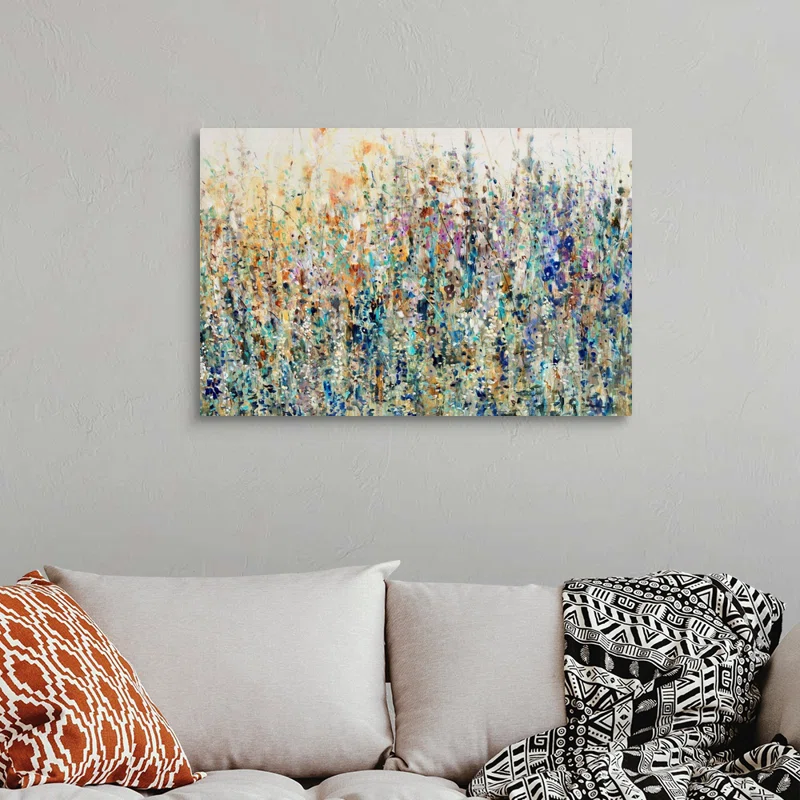 This wall art piece, titled “Thicket Wildflowers,” brings a touch of nature into your home with its floral design. The landscape orientation showcases a vibrant meadow of wildflowers in an abstract style. Printed on a wrapped canvas, this painting is framed with a combination of solid and engineered wood, adding a polished finish. Ideal for adding a splash of color to your living room or bedroom, this artwork is ready to hang and enhance your space with its serene botanical theme.